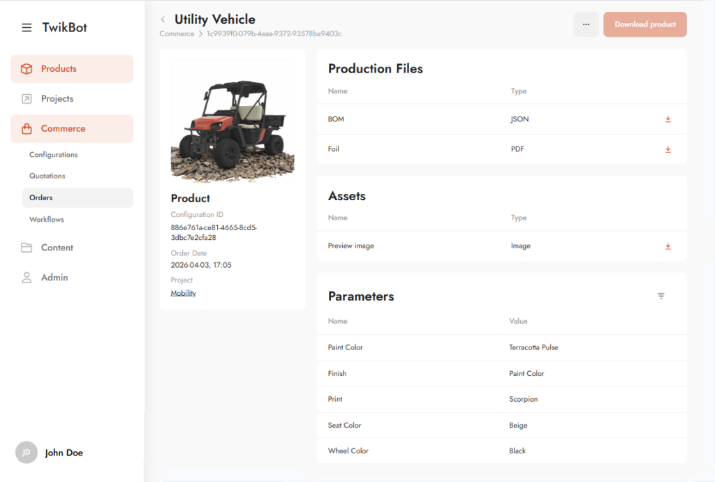 Twikit unites real-time 3D product configurators with powerful configure price quote (CPQ) logic to digitize and automate the entire sales journey. Whether through e-commerce or point of sales, users can visualize, configure, and order fully personalized products in one seamless, integrated workflow. Every order instantly generates production-ready files, eliminating manual efforts and accelerating manufacturing of complex, personalized products.